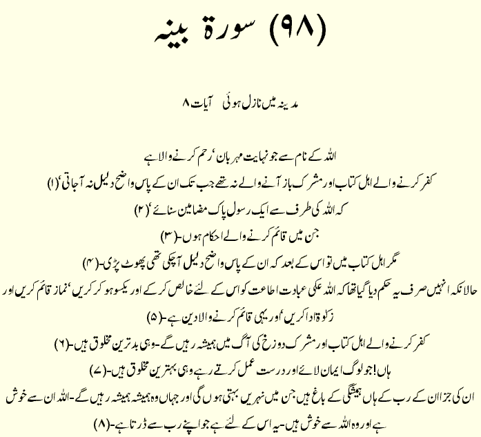 Holy Quran > Urdu Translation > Surah 98- Al-Bayyina